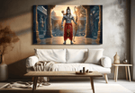 Invite divine grace and profound tranquility into your space with this expansive premium canvas wall art. Featuring a breathtaking portrait of Lord Rama standing powerfully within a grand traditional temple courtyard, this artwork is bathed in the warm, radiant light of a spiritual sunrise. Surrounded by majestic stone pillars, sacred statues, and an ancient banyan tree, the composition captures a sense of awe, righteousness, and timeless devotion. It is an awe-inspiring addition to any wall decor, perfectly celebrating India's rich spiritual heritage.